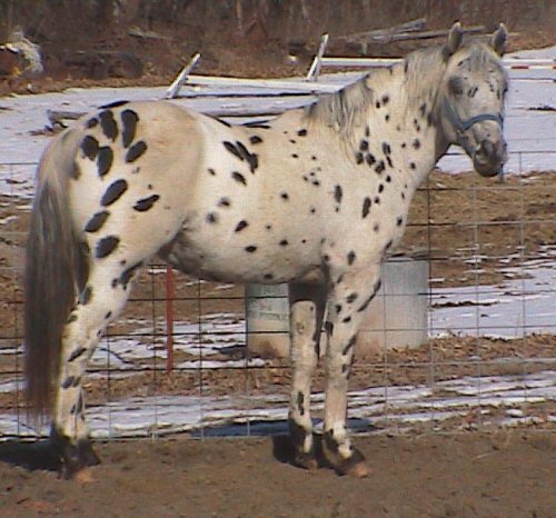 Blue Roan: White with spots over entire body/no face markings/no leg markings//white tipped ears