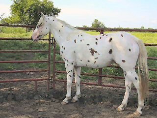 Leopard/white with chestnut spots over entire body/no face markings/no leg markings/varnish marks