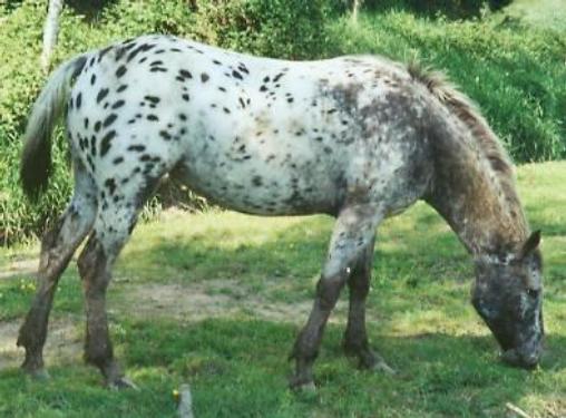 Blue roan/white with spots over entire body/no face markings/no leg markings