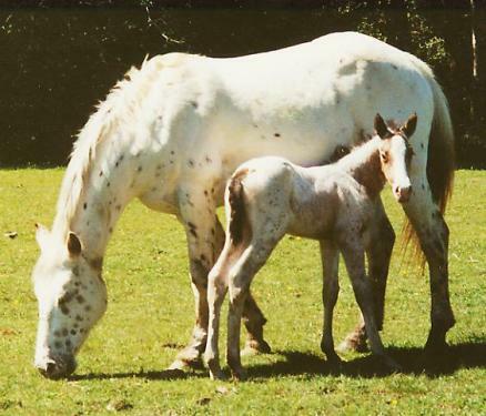 Bay roan/white with spots over entire body/no face markings/no leg markings