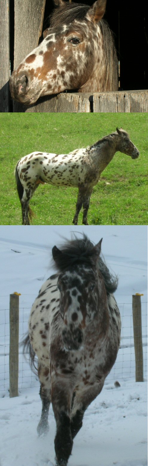 Bay Roan: White with spots over entire body/no face markings/LF-lightning marks/LH-lightning marks/RF-lightning marks/RH-lightning marks