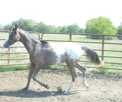 White over back and hips/blaze/snip on lower lip/LH-partial stocking/RF-lightning marks/RH-stocking/roan over entire body