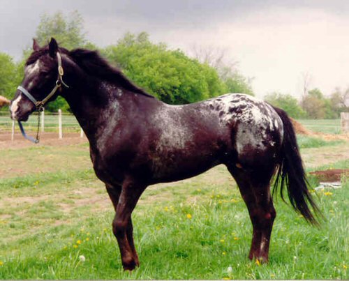 white with black spots over loin & hips/star & snip/LF-no leg markings/LH-coronet/RF-no leg markings/RH-pastern Deceased