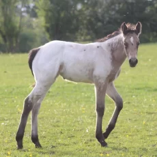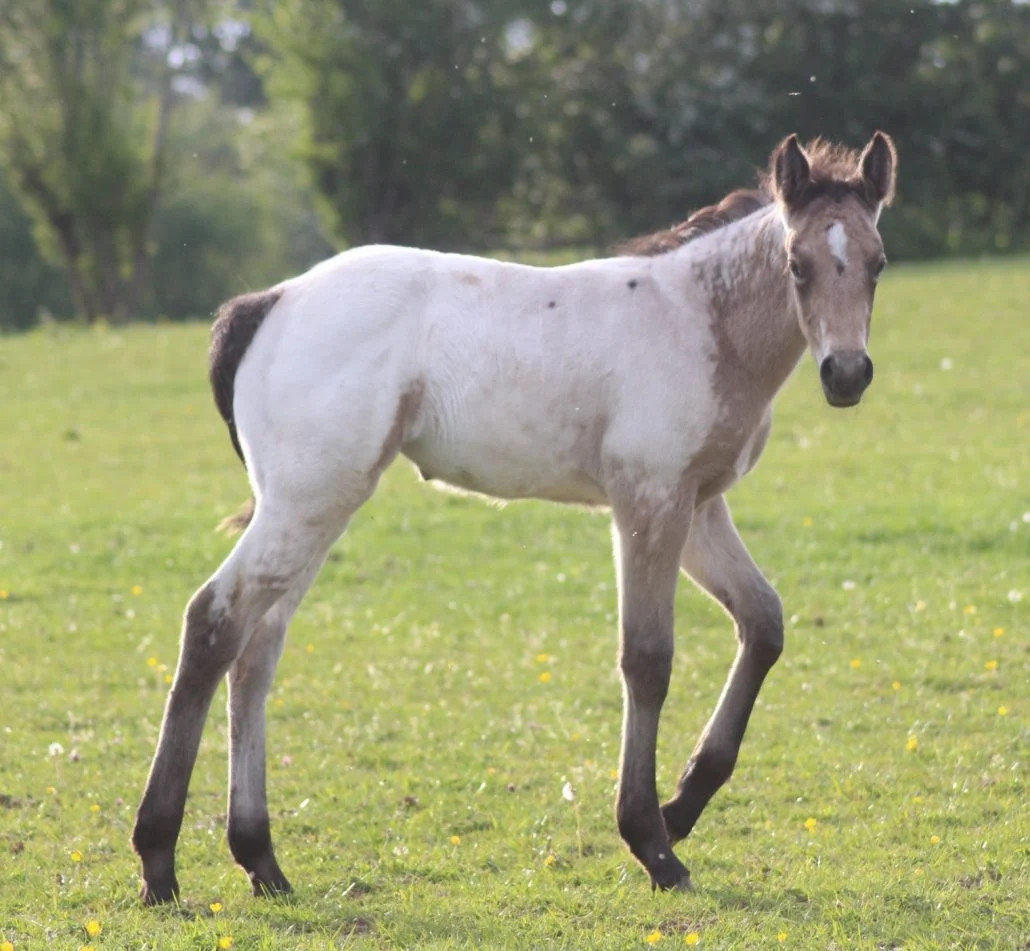 White over body and hips/Star/no leg markings/few buckskin spots/microchip #953010003526021/parentage verified DNA typed/5-panel N/N thru parentage