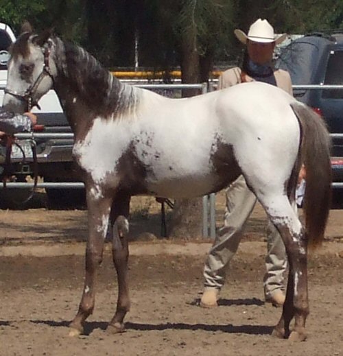 Bay Roan/White over body and hips/star and stripe/LF-lightning marks/LH-lightning marks/RF-lightning markins/RH-lightning marks/few bay spots