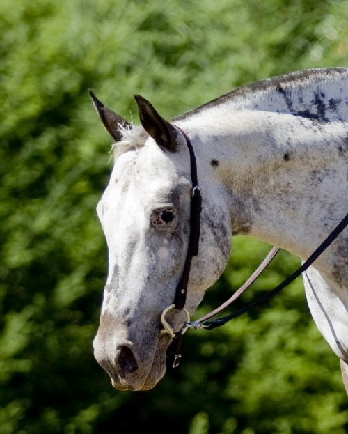 Roan: White over body and hips/no face markings/no leg markings//few bay spots